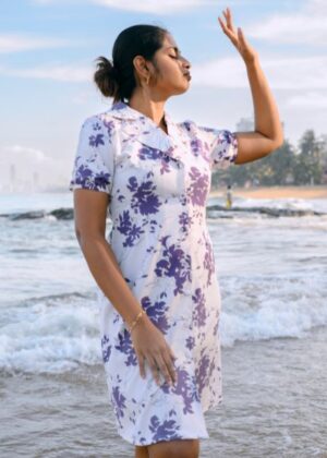 Purple Printed Dress (Short) Short Sleeves Front Button Closure Shirt Collar Model Size – UK 10 Model Wears UK 10 Made in SL Fabric – Polyester blend