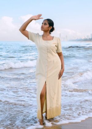 Green Long Dress Front Button Closure Round Neck Short Sleeves Model Size – UK 10 Model Wears UK 10 Made in SL Fabric – PolyCotton
