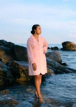Pink Blazer Dress Puff Sleeves with Gathered Hem Front Button Closure Neckline with Lapels Model Size – UK 12 Model Wears UK 12 Made in SL Fabric – PolyCotton